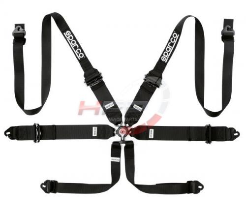 Závodní 6-bodový bezpečnostní pás Sparco. Hliníkové nastavovače a hliníkový zámek. Systém utahování Pull-Up. Povoleno pouze ve spojení se systémy FHR (včetně H.A.N.S.). Uchycení pro ochranný rám (ramena a stehna).