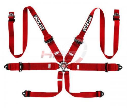 Závodní 6-bodový bezpečnostní pás Sparco. Hliníkové nastavovače a hliníkový zámek. Systém utahování Pull-Up. Povoleno pouze ve spojení se systémy FHR (včetně H.A.N.S.). Uchycení pro ochranný rám (ramena a stehna).