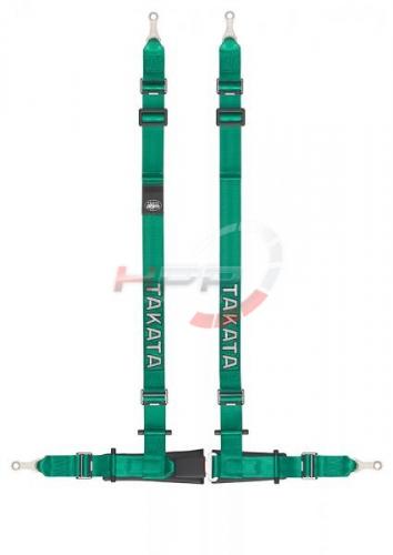 4-bodový sportovní pás TAKATA Drift II v charakteristickém zeleném provedení s homologací ECE pro využití na veřejných komunikacích, případně závodech bez potřeby FIA/SFI homologace. Pás je vybaven centrální tlačítkovou sponou, 51mm (2") ramenními pásy a 51mm (2") pásem v oblasti pasu. Pás je uchycován na montážní oka.