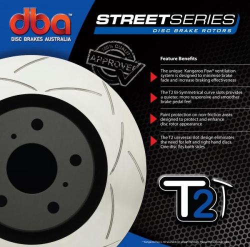 Street Series T2 Slot Design - sportovní kotouče určené pro běžné použití tedy denní ježdění. Řada kotoučů Street Series T2 je určena pro běžné použití u osobních automobilů běžných výkonů. Jsou doporučené pro uživatele, hledající kvalitnější a vzhlednější kotouče než jsou sériové. Tato řada se vyznačuje patentovaným chlazením "Kangaroo paw", bi-symetrickými T2 drážkami snižující vibrace a hluk, což má za následek tišší, vnímavější a hladší odezvu od brzdového pedálu. Design T2 drážek poskytuje rovnoměrné opotřebení destiček a minimalizuje pravděpodobnost vytvrdnutí povrchu. Kotouče jsou také opatřeny černým nátěrem pro prodloužení životnosti.