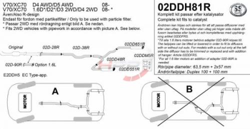 Catback výfuk Simons Volvo V70 / XC70 2WD 1.6 D2/D3/D4 (08-). Kompletní výfukový systém od katalyzátoru. Pasuje pouze na modely s filtrem částic. Pasuje pouze na FWD modely s typem vedení A vyobrazeném na fotce.