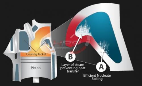 V rámci systému chlazení motoru jsou nejžhavější povrchy ty přilehlé ke spalovací komoře, a to konkrétně vložky válců a hlavy válců. V těchto horkých místech je vysoká pravděpodobnost odpaření vody a snížení efektivního chlazení, vedoucí ke ztrátě výkonu a zbytečnému poškození motoru (viz fyzikální omezení vody). Když chladící kapalina tímto spůsobem selhává, motor se stává ještě žhavější, což vede k dalším přehřátým povrchům a dalšímu odpařování vody.