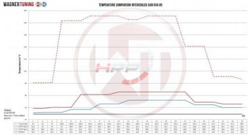 Vysoce výkonné intercoolery 2. generace německého výrobce Wagner Tuning disponují jádry o rozměru 2x 255 x 265 x 90mm a nabízejí o 46% větší chladící plochu a o 89% větší objem vzduchu v porovnání s originálními chladiči. Nově navržené závodní jádro zajišťuje velmi dobrý průtok vzduchu a je také velmi lehké. Bočnice jsou vyrobeny z litého hliníku a zajišťují optimální průtok a vysokou účinnost chlazení, která byla simulovaná a analyzována v CAD programech k docílení nejlepších výsledků. Výsledkem jsou výborné chladící vlastnosti s minimálním zpětným tlakem. Tyto mezichladiče jsou tou nejlepší volbou, pokud jde o nárůst výkonu a snížení teploty nasávaného vzduchu. IC disponují antikorozním ochranným nátěrem s dokonalou charakteristikou rozptýlení tepla. Snadná instalace Plug & Play pouhou výměnou za původní mezichladiče. Wagner Tuning intercoolery zaručují optimální chlazení stlačeného vzduchu s jasným zvýšením výkonu! Všechny výrobky procházejí přísnou kontrolu kvality. Intercoolery byly testovány do 6 barů.
