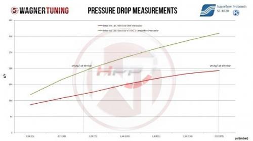 Vysoce výkonný intercooler německého výrobce Wagner Tuning disponuje jádrem o rozměru 520 x 210 x 130mm a nabízí o 85% větší chladící plochu a o 60% větší objem vzduchu v porovnání s originálními chladiči. Nově navržené jádro "tube and fin" zajišťuje velmi dobrý průtok vzduchu a je také velmi lehké. Bočnice jsou vyrobeny z litého hliníku a zajišťují optimální průtok a vysokou účinnost chlazení, která byla simulovaná a analyzována v CAD programech k docílení nejlepších výsledků. Výsledkem jsou výborné chladící vlastnosti s minimálním zpětným tlakem. Tento mezichladič je tou nejlepší volbou, pokud jde o nárůst výkonu a snížení teploty nasávaného vzduchu. IC disponuje antikorozním ochranným nátěrem s dokonalou charakteristikou rozptýlení tepla. Snadná instalace Plug & Play pouhou výměnou za původní mezichladiče. Wagner Tuning intercooler zaručuje optimální chlazení stlačeného vzduchu s jasným zvýšením výkonu! Všechny výrobky procházejí přísnou kontrolu kvality.