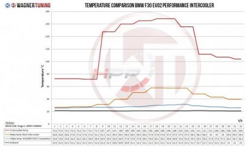 Vysoce výkonný intercooler německého výrobce Wagner Tuning disponuje jádrem o rozměru 520 x 215 x 145mm a nabízí o 85% větší chladící plochu a o 90% větší objem vzduchu v porovnání s originálním chladičem. Nově navržené závodní jádro "tube and fin" zajišťuje velmi dobrý průtok vzduchu a je také velmi lehké. Váha celého intercooleru je 8,8kg. Bočnice jsou vyrobeny z litého hliníku a zajišťují optimální průtok a vysokou účinnost chlazení, která byla simulovaná a analyzována v CAD programech k docílení nejlepších výsledků. Výsledkem jsou výborné chladící vlastnosti s minimálním zpětným tlakem. Tento mezichladič je tou nejlepší volbou, pokud jde o nárůst výkonu a snížení teploty nasávaného vzduchu. IC disponuje antikorozním ochranným nátěrem s dokonalou charakteristikou rozptýlení tepla. Snadná instalace Plug & Play pouhou výměnou za původní mezichladič. Wagner Tuning intercooler zaručuje optimální chlazení stlačeného vzduchu s jasným zvýšením výkonu! Všechny výrobky procházejí přísnou kontrolu kvality.