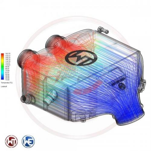 Vysoce výkonný intercooler německého výrobce Wagner Tuning disponuje jádrem o rozměru 287 x 185 x 115mm a nabízí o 114% větší objem vzduchu v porovnání s originálním chladičem. Nově navržené závodní jádro "tube and fine" zajišťuje velmi dobrý průtok vzduchu a je také velmi lehké. Bočnice jsou vyrobeny z litého hliníku a zajišťují optimální průtok a vysokou účinnost chlazení, která byla simulovaná a analyzována v CAD programech k docílení nejlepších výsledků. Výsledkem jsou výborné chladící vlastnosti s minimálním zpětným tlakem. Tento mezichladič je tou nejlepší volbou, pokud jde o nárůst výkonu a snížení teploty nasávaného vzduchu. IC disponuje antikorozním ochranným nátěrem s dokonalou charakteristikou rozptýlení tepla. Snadná instalace Plug & Play pouhou výměnou za původní mezichladiče. Wagner Tuning intercooler zaručuje optimální chlazení stlačeného vzduchu s jasným zvýšením výkonu! Všechny výrobky procházejí přísnou kontrolu kvality.