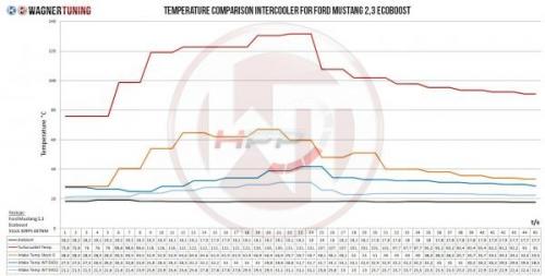Vysoce výkonný intercooler německého výrobce Wagner Tuning disponuje jádrem o rozměru 535 x 392 x 95mm a nabízí o 175% větší chladící plochu a o 226% větší objem vzduchu (19,9 litrů) v porovnání s originálním chladičem. Nově navržené závodní jádro zajišťuje velmi dobrý průtok vzduchu a je také velmi lehké. Váha celého intercooleru je 14,2kg. Bočnice jsou vyrobeny z litého hliníku a zajišťují optimální průtok a vysokou účinnost chlazení, která byla simulovaná a analyzována v CAD programech k docílení nejlepších výsledků. Výsledkem jsou výborné chladící vlastnosti s minimálním zpětným tlakem. Tento mezichladič je tou nejlepší volbou, pokud jde o nárůst výkonu a snížení teploty nasávaného vzduchu. IC disponuje antikorozním ochranným nátěrem s dokonalou charakteristikou rozptýlení tepla. Snadná instalace Plug & Play pouhou výměnou za původní mezichladič. Wagner Tuning intercooler zaručuje optimální chlazení stlačeného vzduchu s jasným zvýšením výkonu! Všechny výrobky procházejí přísnou kontrolu kvality. Testován do 6 barů.