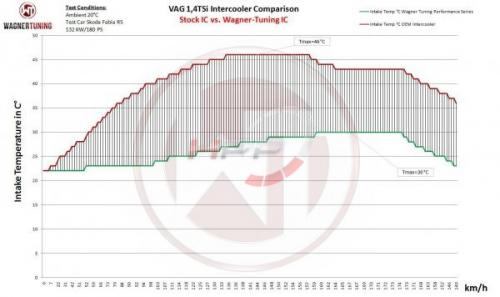 Vysoce výkonný intercooler německého výrobce Wagner Tuning disponuje jádrem o rozměru 590 x 170 x 100mm a nabízí o 70% větší chladící plochu a o 112% větší objem vzduchu v porovnání s originálním chladičem. Jádro zajišťuje velmi dobrý průtok vzduchu a je také velmi lehké. Váha celého intercooleru je pouhých 8,2kg. Bočnice jsou vyrobeny z litého hliníku a zajišťují optimální průtok a vysokou účinnost chlazení, která byla simulovaná a analyzována v CAD programech k docílení nejlepších výsledků. Výsledkem jsou výborné chladící vlastnosti s minimálním zpětným tlakem. Tento mezichladič je tou nejlepší volbou, pokud jde o nárůst výkonu a snížení teploty nasávaného vzduchu. IC disponuje antikorozním ochranným nátěrem s dokonalou charakteristikou rozptýlení tepla, byl testován do 6 barů. Snadná instalace Plug & Play pouhou výměnou za původní mezichladič. Wagner Tuning intercooler zaručuje optimální chlazení stlačeného vzduchu s jasným zvýšením výkonu! Všechny výrobky procházejí přísnou kontrolu kvality.