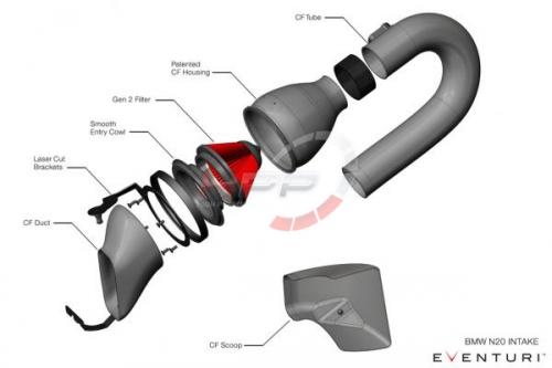 Tento kit sání Eventuri pro vozy BMW vybavené motory N20 sestává z řady komponentů vyrobených z prepreg karbonu výhradně pro tento konkrétní kit sání a to se specifickým účelem. Všechny součásti kitu byly vyvinuty a jsou vyrobeny dle těch nejvyšších standardů.