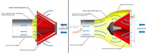 Samotný airbox se skládá vysoce propustného sportovního filtru, hliníkové příruby, ocelového laserem řezaného držáku a samotného airboxu z prepreg karbonu. Díky specifickému tvaru airboxu s reverzně umístěnou vložkou filtru, je nasávaný vzduch dokonale směrován do sací trubky. Tato pozvolná redukce bez ostrých přechodů vyvolává tzv. venturi efekt, kdy proudicí vzduch zrychluje a přitom si zachovává laminární proudění. Tento efekt je vysvětlen na obrázku níže.