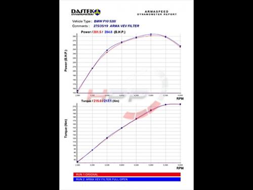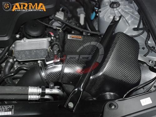 Poznámka: k dispozici je také variabilní typ sání za příplatek, který je viditelný na fotkách. Ten obsahuje vzduchový filtr s nerezovou konstrukcí a vestavěnou klapkou, která je ovládána elektronicky pomocí dálkového ovladače a řídící jednotky napojenou do OBDII konektoru. Hlavním cílem je obnova ztráty kroutícího momentu hlavně v nízkých otáčkách, což je častý jev u sportovních filtrů. Klapka umožňuje individuálně nastavit proudění vzduchu pomocí dálky nebo Wi-Fi aplikace v chytrém telefonu (Apple, Google). Tento systém je patentován v Německu firmou Arma.