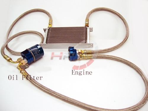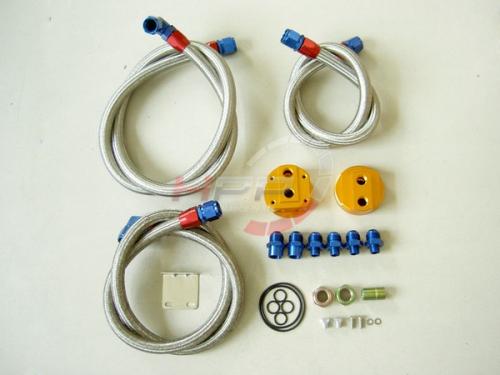 Olejový relokační adaptér s pancéřovými hadicemi. Kompetní kit pro montáž přídavného olejového chladiče.