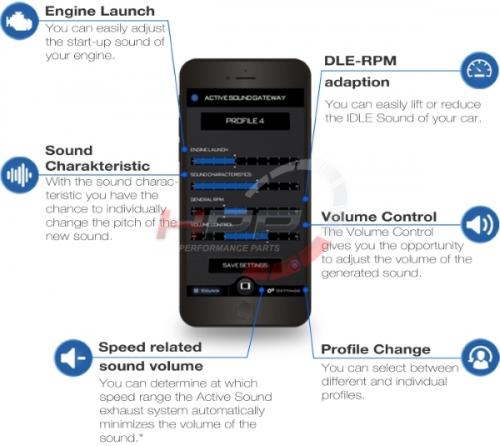 - Aplikace má následující funkce: zvuk nastartování motoru, typ zvuku, přizpůsobení hlasitosti v závislosti na rychlosti, přizpůsobení zvuku a hlasitosti na volnoběh, celková hlasitost, změna a přizpůsobení profilů.