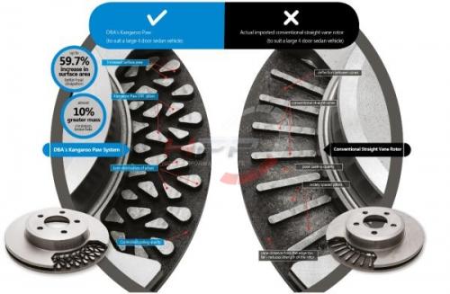 Brzdové kotouče DBA 4000 Series T3 jsou vysoce výkonnou, ale stále přímou náhradou továrních brzdových kotoučů. Jsou vhodné jak do běžného provozu, tak pro použití během track days, případně tam, kde je vyžadován větší brzdný účinek. Kotouče 4000 Series T3 jsou odlévány z legované oceli s vysokým obsahem uhlíku a poté teplotně stabilizovány tak, aby byly schopné odolávat extrémnímu a opakovanému mechanickému i teplotnímu namáhání. O maximálně efektivní odvětrávání se stará patentovaný tzv. Kangaroo Paw systém chlazení. Jedná se o soustavu kanálů, kde proudicí vzduch obkresluje tvar klokaní tlapy. Kromě zvětšení účinné plochy pro odvod tepla až o 20%, představuje tato konstrukce rovnoměrnější podporu pro činnou plochu kotouče.