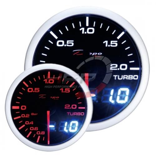 Budík série Dual View firmy Depo Racing. Budíky jsou podsvícené bílou a červenou LED diodou. Lze tedy vybrat požadovanou barvu. Zobrazují hodnoty jak analogově tak digitálně. Jsou výborně viditelné i při ostrém slunci. Montážní hloubka je 25mm. Balení obsahuje elektronický senzor tlaku, stínítko, držák na palubovku, kabeláž a montážní materiál.