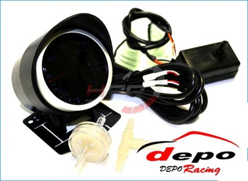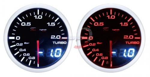 Budík série Dual View firmy Depo Racing. Budíky jsou podsvícené bílou a červenou LED diodou. Lze tedy vybrat požadovanou barvu. Zobrazují hodnoty jak analogově tak digitálně. Jsou výborně viditelné i při ostrém slunci. Montážní hloubka je 25mm. Balení obsahuje elektronický senzor tlaku, stínítko, držák na palubovku, kabeláž a montážní materiál.