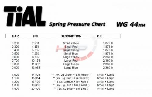 Pokud použijete instalaci dvou pružin najednou, lze dosáhnout vyššího tlaku. Např. velká modrá + malá modrá - 1.6 bar (23.20 psi) ve wastegatu Tial 38mm. Kombinaci pružin a výsledných tlaků lze nalézt v popisu jednotlivých modelů wastegatů Tial Sport.