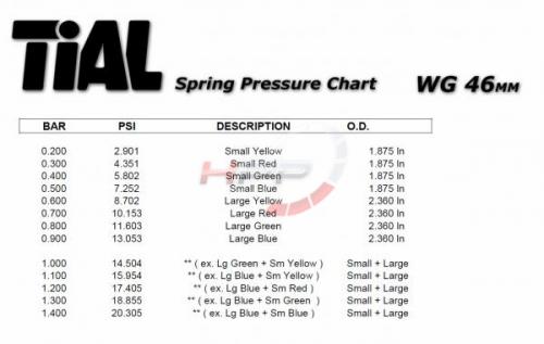 Pokud použijete instalaci dvou pružin najednou, lze dosáhnout vyššího tlaku. Např. velká modrá + malá modrá - 1.6 bar (23.20 psi) ve wastegatu Tial 38mm. Kombinaci pružin a výsledných tlaků lze nalézt v popisu jednotlivých modelů wastegatů Tial Sport.