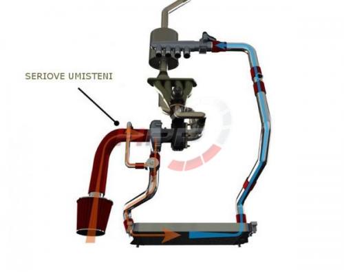 - Zpětný tlak je odkloněn přímo před škrticí klapku, díky umístění ventilu za mezichladič, dochází tedy k cirkulaci pouze studeného vzduchu (viz fotka).