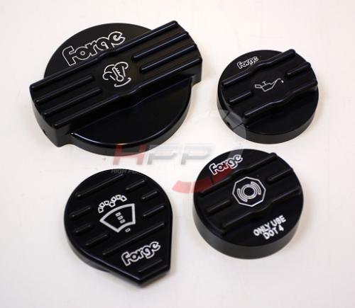 Set krytů víček na olej, vodu, brzdy, ostřikovače Forge Motorsport - černé/leštěný hliník. Pasují na většinu 2.0 TFSi motorů od roku 2014.