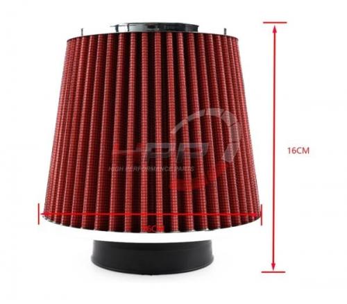 Sání je určené pro maximální průtok nasávaného vzduchu. Dodává motoru agresivní vzhled a zvuk. Zvyšuje tedy značně výkonový potenciál. Sání využívá vysoce prodyšný sací filtr, který nasává vzduch ze předu vozidla. Nahrazuje plně originální airbox. Součástí balení je všechen potřebný instalační materiál a odclonění (viz foto), které zabraňuje nasávání nežádoucího horkého vzduchu. Nasávaný chladný vzduch je veden bez restrikcí přímo do motoru. Barevné provedení je v červené práškové barvě. Filtr je určen pro opakované použití (omyvatelný). Sání má průměr vedení 70mm se zůžením na 57mm s vývodem na blow off ventil (lze jej zaslepit). Rozměr filtru je 160mm délka, 160mm průměr, hrdlo 76mm.