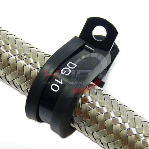 Hliníkový eloxovaný obal. Gumová vložka chrání hadici před poškozením. Eliminuje vibrace. Určeno pro opletené hadice nebo teflonové PTFE. Snadná instalace pomocí šroubu. Univerzální použití.