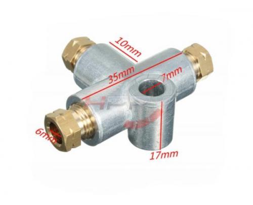 Téčko s výstupy 3x trubka 3/16" (4,75mm) se závity M10 x 1.0. Montážní držák pro upevnění.