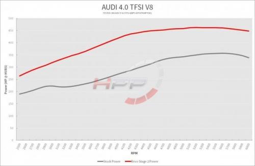 - Zážehová jednotka 4.0 V8 TFSI je velmi návyková, a to nejen pro svůj neobyčejný zvukový projev, ale i z důvodu skvělé dynamiky. Turbem přeplňovaný motor dává již v sérii pěkných 420PS a 550Nm. Stage 2 software je navržen tak, aby maximalizoval potenciál tohoto motoru, zlepšil odezvu na plynový pedál a zvýšil výkon i točivý moment v celém spektru otáček.