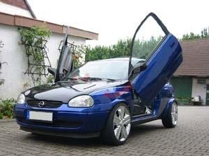 Kompletní systém vertikálního otevírání dveří LSD (Lambo Style Doors) pro Opel Corsa typ Corsa B, -B, S93, rok výroby 03/93-8/00, 3 dveře. Originální systém od německého výrobce KW Automotive. Jednoduchá montáž na originální úchyty pantů dveří bez nutnosti zásadních zásahů do karoserie vozu. Kompletní dodávka včetně montážního příslušenství. Bezpečný systém testovaný crash testy. Homologace TÜV.