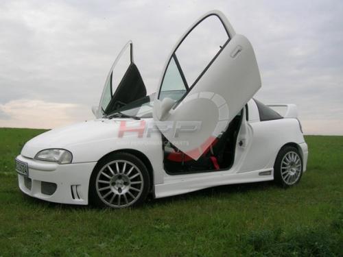 Kompletní systém vertikálního otevírání dveří LSD (Lambo Style Doors) pro Opel Tigra typ S93 coupe, rok výroby 11/94-. Originální systém od německého výrobce KW Automotive. Jednoduchá montáž na originální úchyty pantů dveří bez nutnosti zásadních zásahů do karoserie vozu. Kompletní dodávka včetně montážního příslušenství. Bezpečný systém testovaný crash testy. Homologace TÜV.