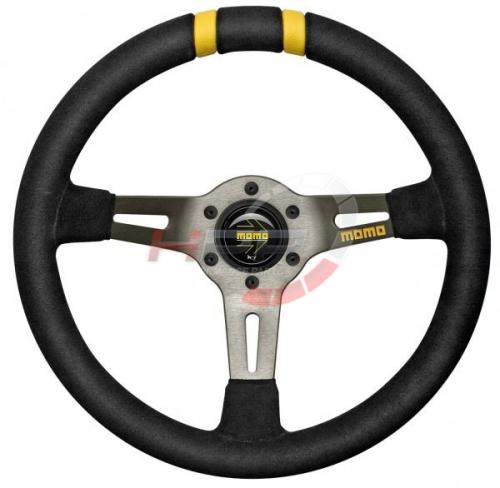 Sportovní tříramenný semišový volant Momo model Drifting inspirovaný designem závodních volantů, hlavně jejich tvarem, hlubokým odsazením a menším průměrem, který je oproti klasickým modelům ještě menší. Jeho ergonomie a velikost poskytuje dobré a přesně ovládání. Efektními prvky jsou žluté zdvojené ukazatele přímého směru a žluté logo Momo na pravém paprsku. Ideální pro závodní účely nebo drift.