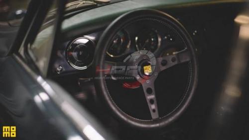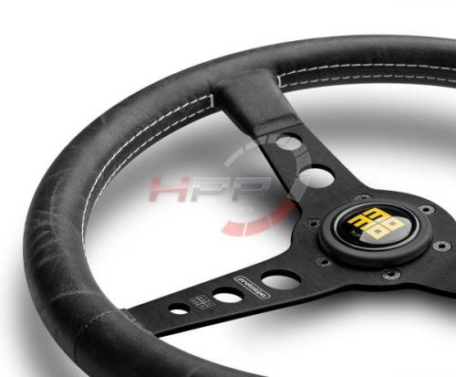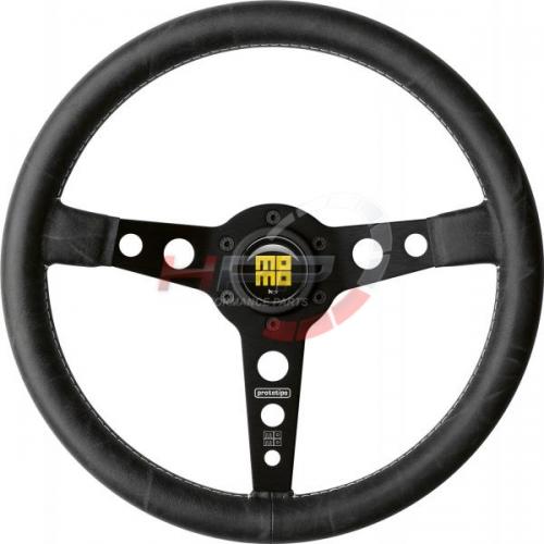 Sportovní kožený volant Momo model Prototipo v klasickém designu, který je typický středem s kruhovými odlehčenými otvory. Volant je obšitý pravou černou kůží s "vintage" vzorem s kontrastním světlým prošíváním.