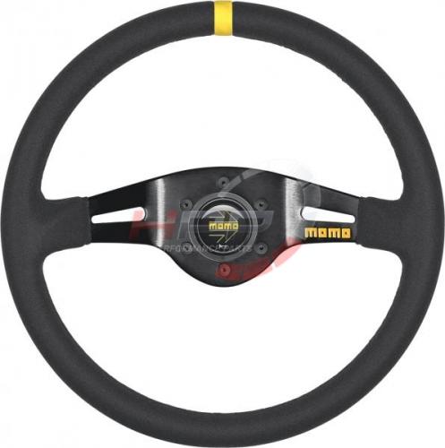 Závodní semišový volant Momo model 03 se dvěma paprsky. Lehká a snadná ovladatelnost díky absenci spodního paprsku. Středící proužek ve žluté barvě pro snadnou identifikaci volantu.