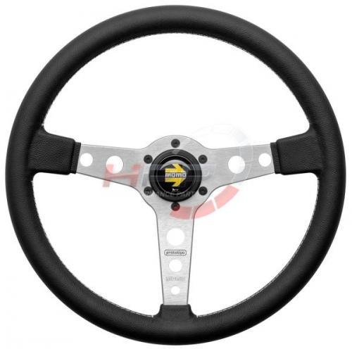 Sportovní kožený volant Momo model Prototipo v klasickém designu, který je typický středem s kruhovými odlehčenými otvory. Volant je obšitý pravou černou kůží s kontrastním světlým prošíváním.