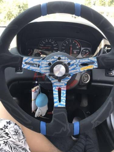 Sportovní semišový volant Momo model Ultra s průměrem 350mm a odsazením 90mm inspirovaný závodní tematikou. Semišový věnec zobrazuje nejznámější závodní tratě. Střed zaujme četným zobrazením loga Momo.