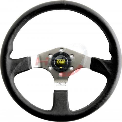Sportovní tříramenný OMP s chromovým středem kombinuje věnec z kůže a zvětšené bicepsové úchyty. Efektivní prvky v podobě frézovaného loga OMP ve spodní části paprsku a žlutého loga ve středu volantu v houkačce. Bicepsy napomáhají lepšímu ovládání a práci s volantem.