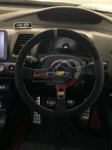 Závodní tříramenný semišový volant OMP model Corsica. Středící proužek ve žluté barvě, eloxované paprsky v černé barvě s vybráním. Věnec volantu je prošitý žlutou nití. Dostatečné odsazení zajišťuje perfektní a přesnou práci s volantem. Efektivní prvky v podobě žlutého loga OMP na spodním paprsku a středové houkačky se žlutým logem OMP.