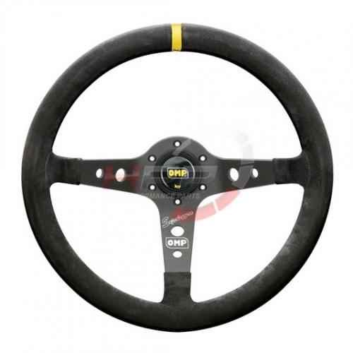 Závodní tříramenný semišový volant OMP model Corsica Superleggero. Středící proužek ve žluté barvě, černě eloxované paprsky. Dostatečné odsazení zajišťuje perfektní a přesnou práci s volantem. Efektivní prvky v podobě loga OMP a názvu volantu "Superleggero" na spodním paprsku, středové houkačky se žlutým logem OMP.