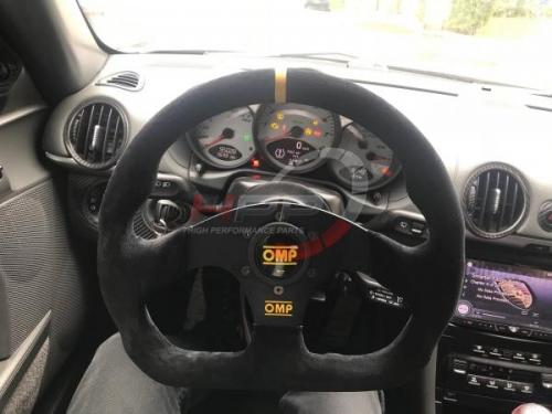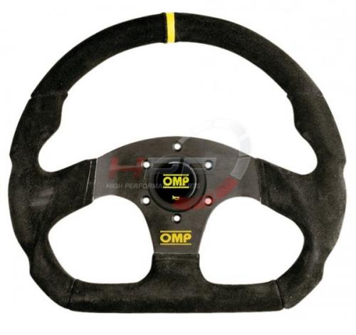 Závodní tříramenný semišový volant OMP model Superquadro. Ploché dno poskytuje více prostoru pro nohy. Eloxované paprsky. Zvolené materiály a tvarované bicepsy zajišťují perfektní a přesnou práci s volantem. Efektivní prvky v podobě žlutého loga OMP na spodním paprsku a středové houkačky se žlutým logem OMP.
