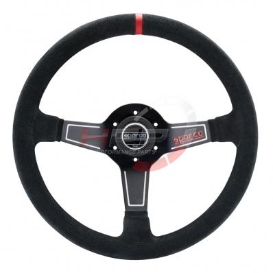 Sportovní semišový tříramenný Sparco model L375 Nero s černým středem kombinuje věnec z černé broušené kůže a efektivní prvky v podobě červeného loga Sparco na pravém paprsku věnce, loga ve středu volantu v houkačce a středícího proužku v červené barvě.