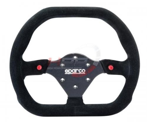 Závodní tříramenný semišový volant Sparco model P310 s atypickým tvarem. Ploché dno poskytuje více prostoru pro nohy. Horní seseknutý věnec poskytuje lepší výhled před sebe. Eloxované paprsky. Zvolené materiály zajišťují perfektní a přesnou práci s volantem. Efektivní prvek v podobě loga Sparco uprostřed. Volant je také vybaven dvěma klasickými tlačítky, která lze připojit k podpoře různých závodních systémů.