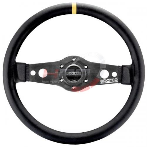 Závodní dvouramenný kožený volant Sparco model R215. Černé eloxované paprsky s vybráním. Věnec potažený kvalitní černou semiší zajišťuje perfektní a přesnou práci s volantem. Efektivní prvky v podobě loga Sparco na pravém paprsku a středové houkačky s logem. Středící proužek ve žluté barvě.