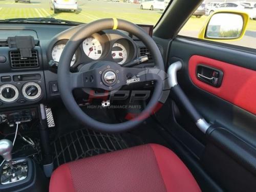 Závodní dvouramenný semišový volant Sparco model R215 Safari. Černé eloxované paprsky s vybráním. Věnec potažený kvalitní černou semiší zajišťuje perfektní a přesnou práci s volantem. Efektivní prvky v podobě loga Sparco na pravém paprsku a středové houkačky s logem. Středící proužek ve žluté barvě.
