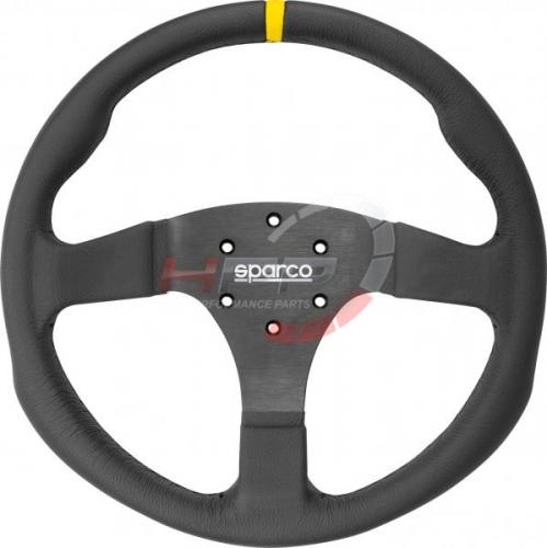 Závodní tříramenný kožený volant Sparco model R330. Černé eloxované paprsky a zvětšené bicepsy. Věnec potažený kvalitní černou kůží zajišťuje perfektní a přesnou práci s volantem. Efektivní prvky v podobě loga Sparco ve středu volantu a středícího proužku ve žluté barvě.