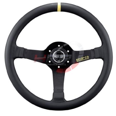 Závodní tříramenný kožený volant Sparco model R345 Monza. Černé eloxované paprsky. Věnec potažený kvalitní černou kůží zajišťuje perfektní a přesnou práci s volantem. Efektivní prvky v podobě loga Sparco na pravém paprsku a středové houkačky s logem. Středící proužek ve žluté barvě.