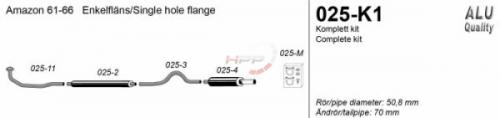 Výfukový systém Simons Volvo Amazon (61-66). Kompletní výfukový systém od výfukových svodů. Určeno pro modely s jedním vývodem (single hole flange).