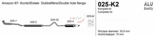 Výfukový systém Simons Volvo Amazon kombi (67-). Kompletní výfukový systém od výfukových svodů. Určeno pro modely s dvěma vývody (double hole flange).
