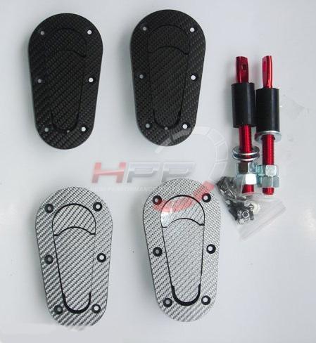 Zámky / držáky kapoty D1 Spec - stříbrný karbon. Standardní zavírání. Montáž z vrchu kapoty.